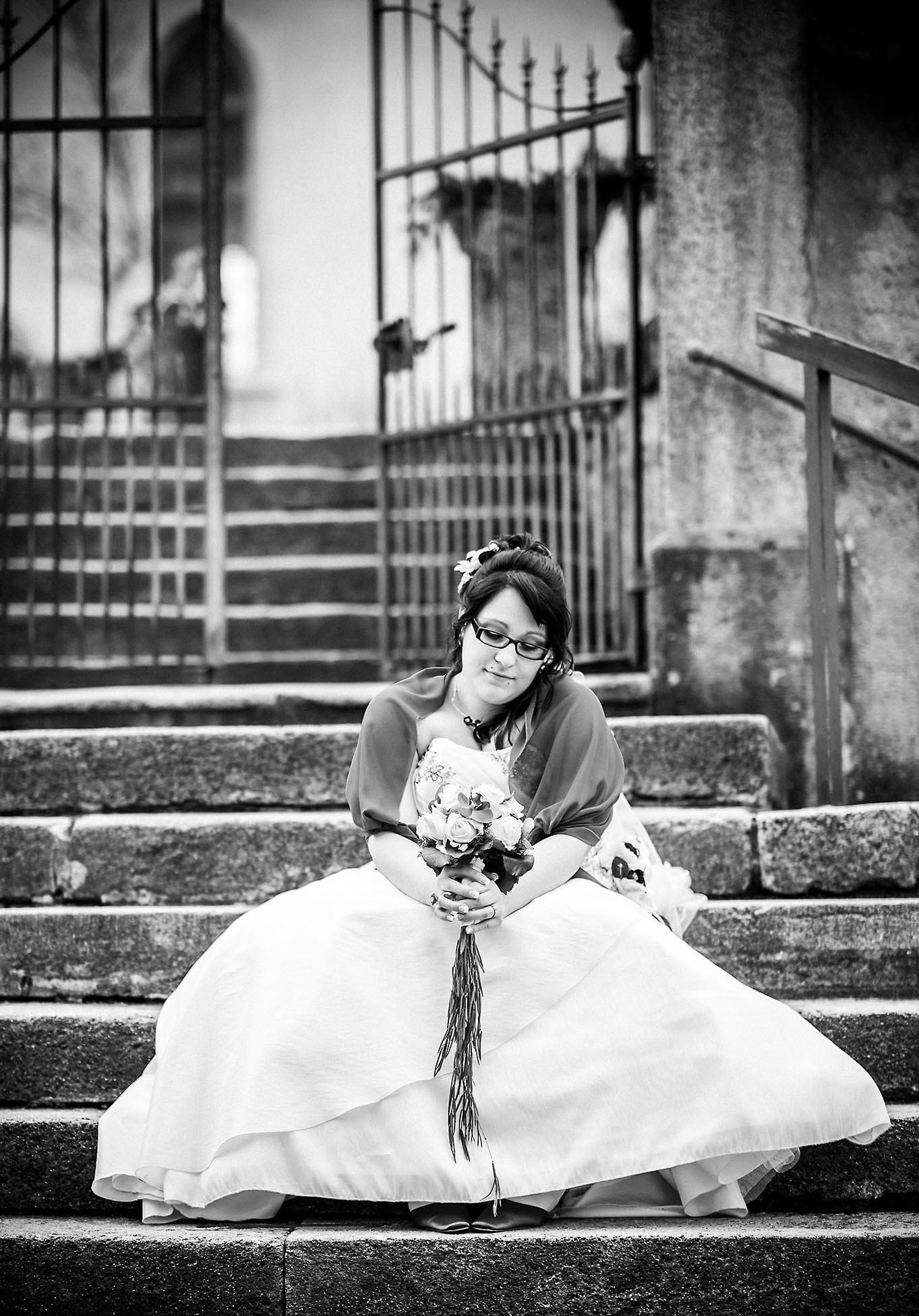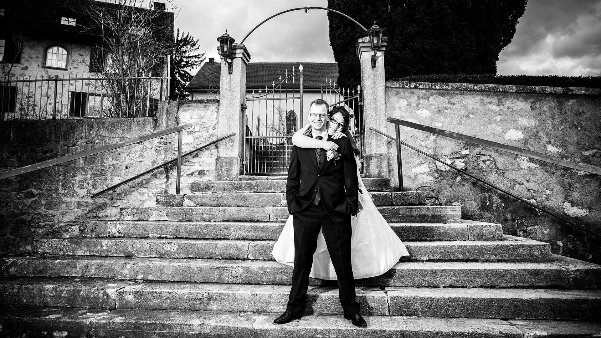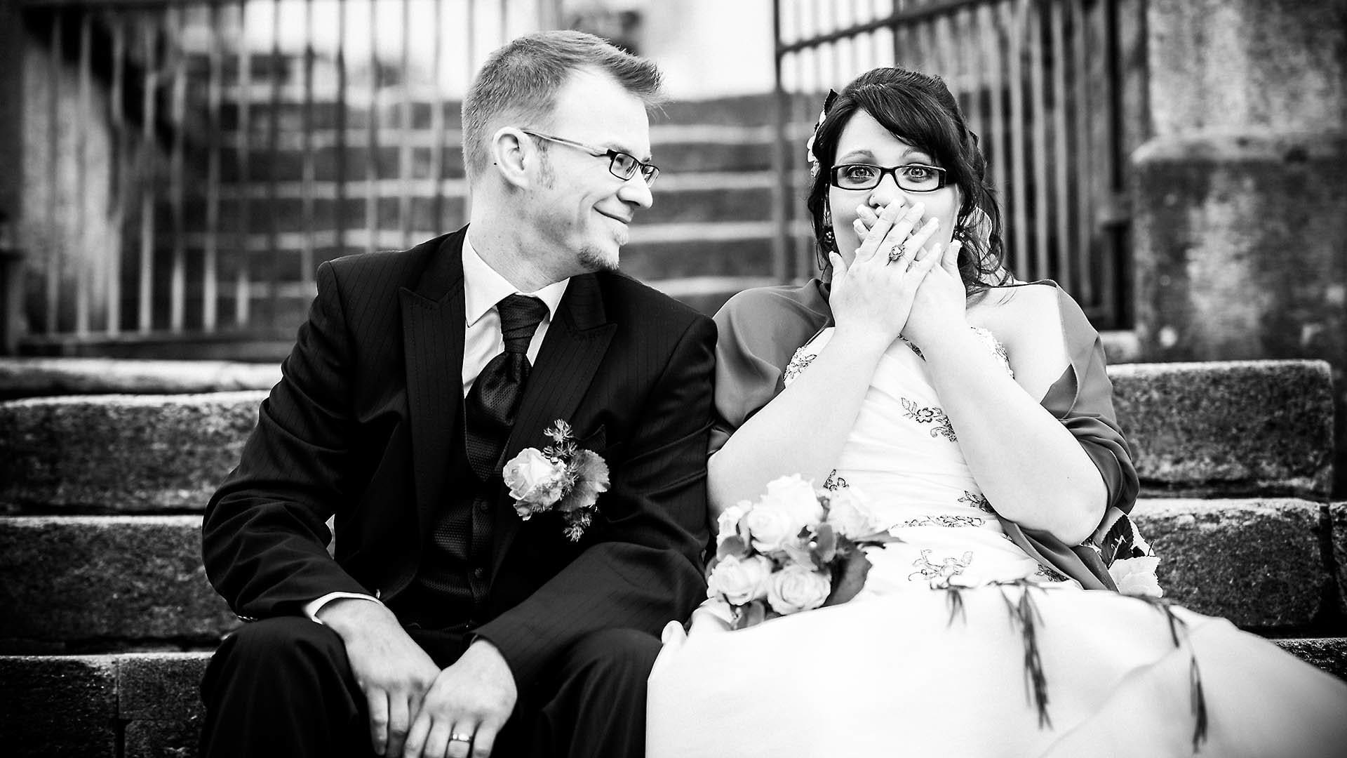 - Braut und Bräutigam gemeinsam auf der Treppe, Hochzeitsfotograf
